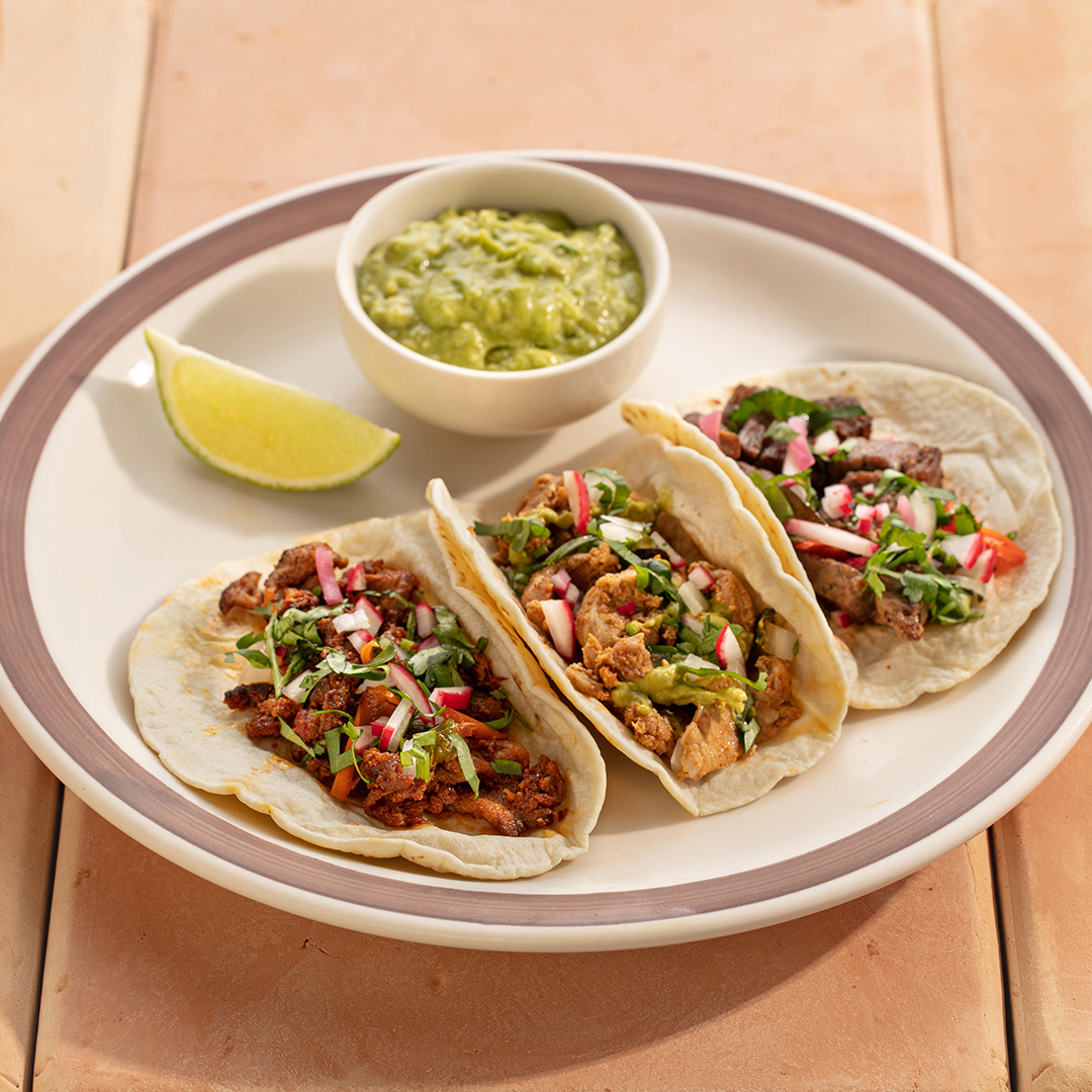 Choice of any 3 tacos and salsa. Served with cilantro, and onions.